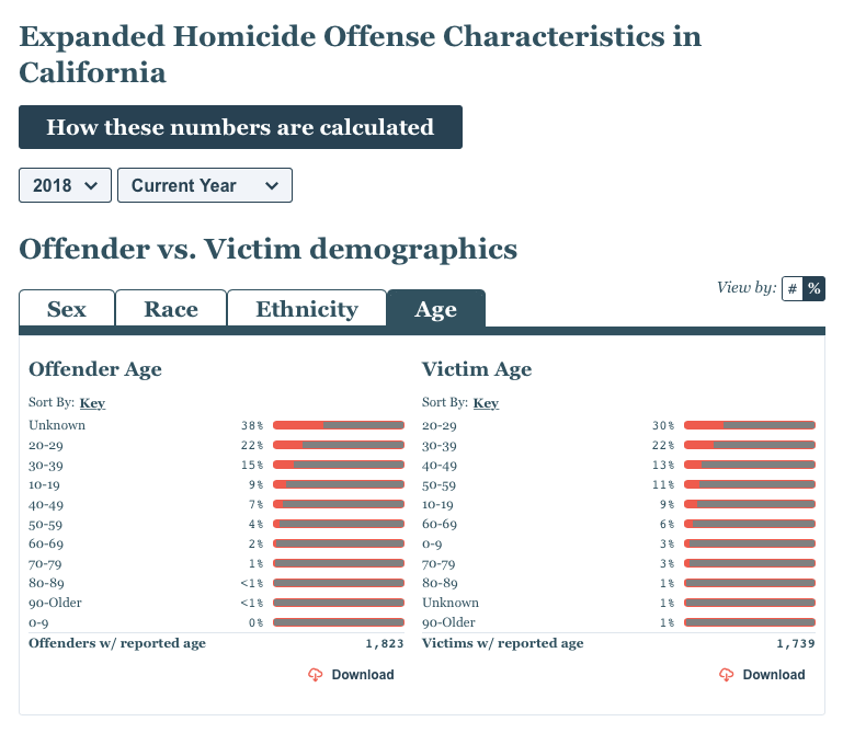 With great visuals of data from 1985 to 2018 on violent as well as property crimes, CDE is perfect to compare states’ crime levels vs. the country as a whole. Unlike the first crime database, the CDE has much more detailed homicide and property crime statistics. Want to know the age breakdown of homicide offenders? Or perhaps the most common murder weapon? Maybe the circumstances at the time of the homicide? All of these questions and more can be answered using the visually appealing CDE.